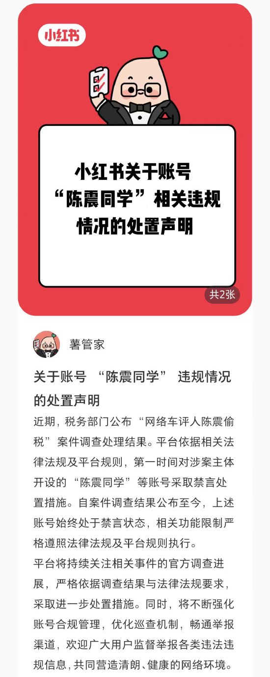 新浪科技讯 12月22日下午消息,今日,小红书发布《关于账号 “陈震同学” 违规情况的处置声明》。说明提到,近期,税务部门公布“网络车评人陈震偷税”案件调查处理结果。平台依据相关法律法规及平台规则,第2025-12-25
